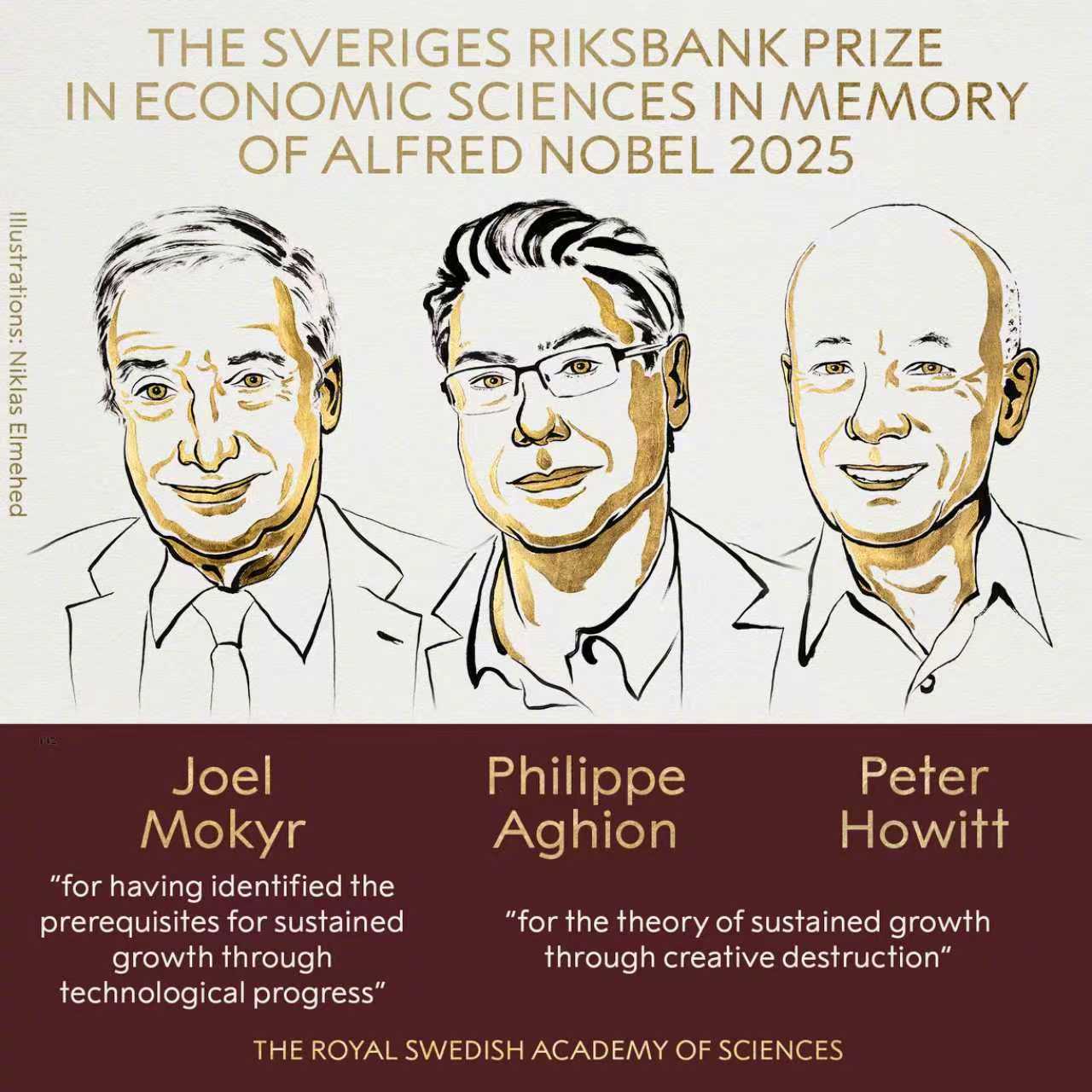 【诺贝尔经济学奖揭晓:3名经济学家获奖,表彰其“对创新驱动型经济增长的阐释”】10月13日,2025年诺贝尔经济学奖得主揭晓。瑞典皇家科学院决定将2025年度瑞典中央银行纪念阿尔弗雷德·诺贝尔经济学奖授予乔尔·莫基尔、菲利普·阿吉翁和彼得·豪伊特卓信速配,以表彰他们“对创新驱动型经济增长的阐释”。