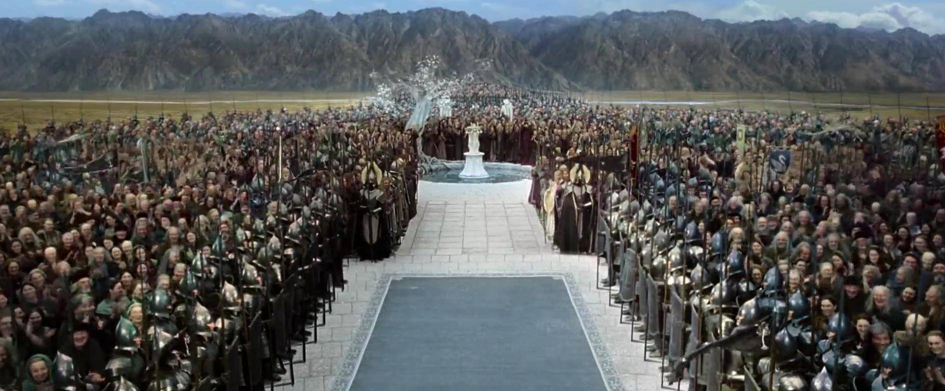 在战胜索伦之后,我们看到米那斯提力斯(南方王国的首都)的场景,甘道夫将王冠戴在阿拉贡头上,并说道:“人皇的时代来临了,愿它得到赐福” ,随后,阿拉贡对甘道夫微笑,并转向人群,人群则对他报以热烈的欢呼。